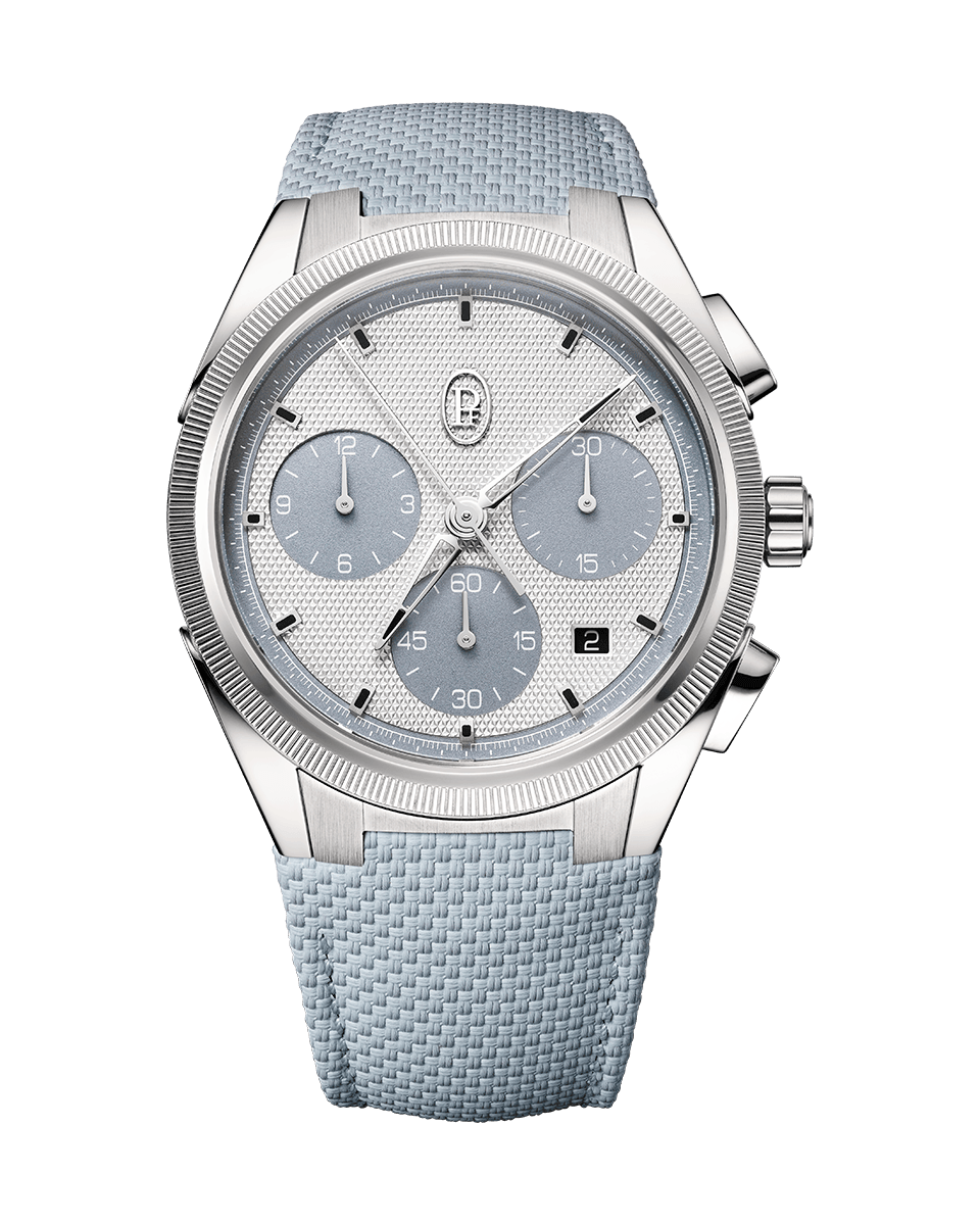 TONDA PF Sport Kronograf 42 mm çapındadır ve belirgin tırtıklı bir çerçeveye sahiptir, sportif karakterini vurgulayan cesur bir ışık ve yansıma etkileşimi yaratır. Kadran, elle guilloche yapılmış 'üçgen çivi' deseniyle dekore edilmiştir. Uygulanan saat işaretleri siyah SuperLuminova ile kaplanmıştır.