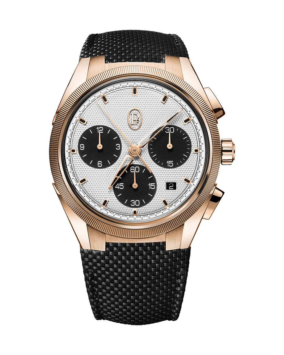 TONDA PF Sport Kronograf 42 mm çapındadır ve sportif karakterini vurgulayan cesur bir ışık ve yansıma etkileşimi yaratan belirgin bir tırtıklı çerçeveye sahiptir. Kadran, elle guilloche yapılmış 'üçgen çivi' deseniyle dekore edilmiştir. Uygulanan saat işaretleri siyah SuperLuminova ile kaplanmıştır.