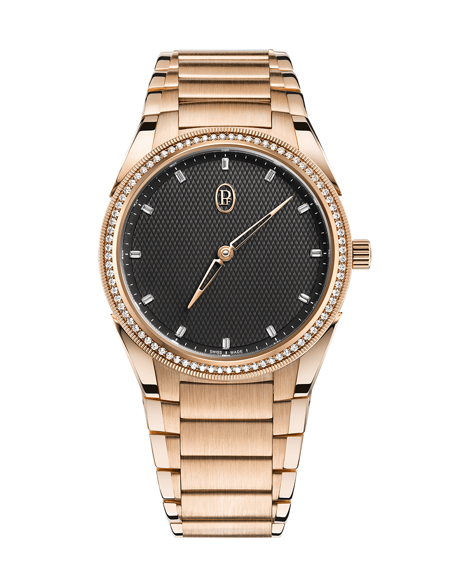 TONDA PF Automatic 36mm hem gösterişli hem de narindir. 18 ayar pembe altından yapılmış ve elmaslarla süslenmiştir, Parmigiani Fleurier'in varsayılan hafiflik ve kıymetliliğinin ruhunu ustaca çağrıştırır. Değerli taşların taçtan bileziğin yanlarına doğru izlediği desen, modele tam görsel kimliğini verir ve bileziğin akışkanlığını artırır.